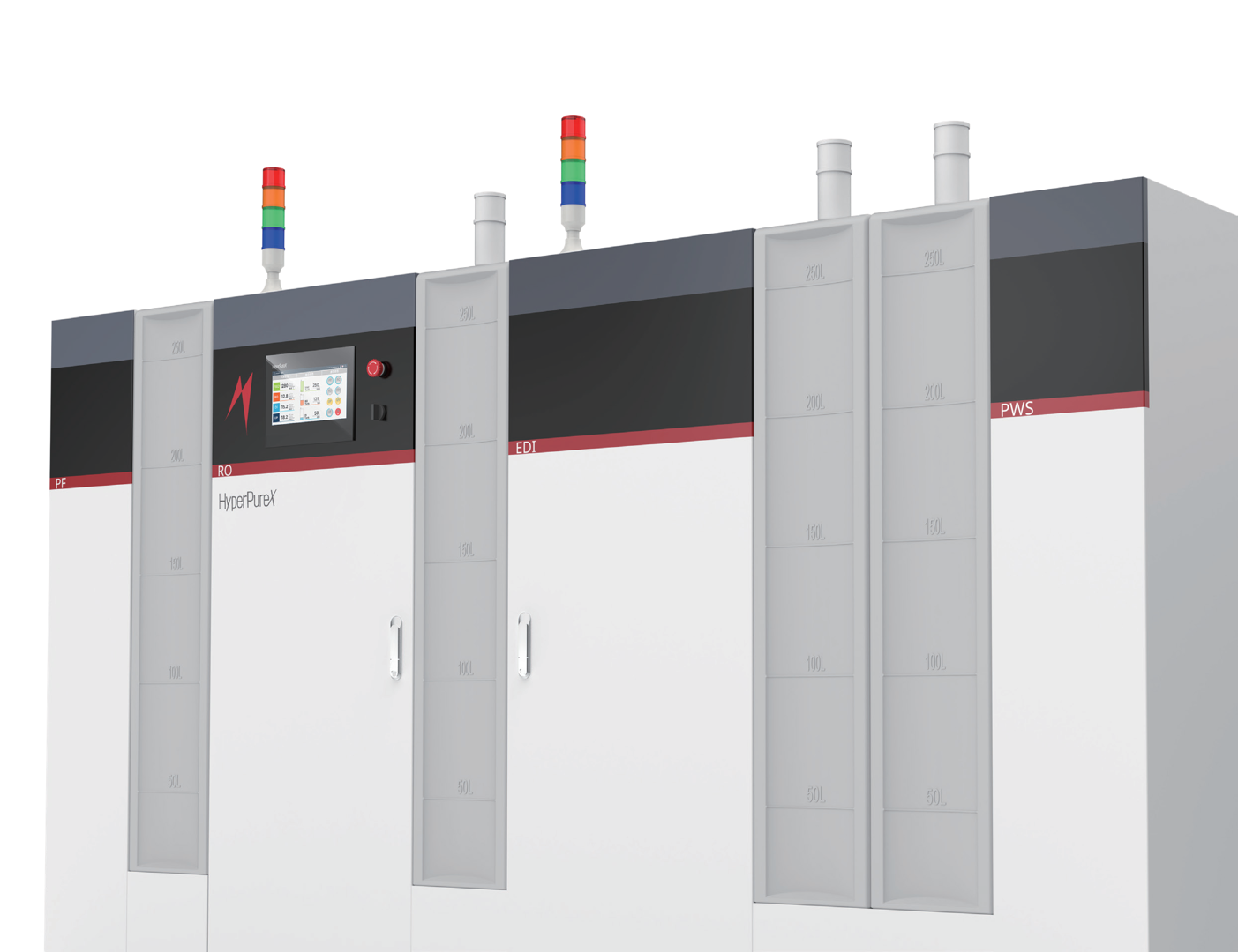 PF前処理モジュール、RO逆浸透モジュール、EDIおよびHyper超純化モジュール、ならびにPWS貯蔵・分配モジュールという4つの独立した特有モジュールで構成されており、水精製システムのすべての中核部品を高度に統合しています。各モジュールはそれぞれ単独のシステムとして独立運用が可能であると同時に、他の純水システムとも柔軟に適合・接続できます。