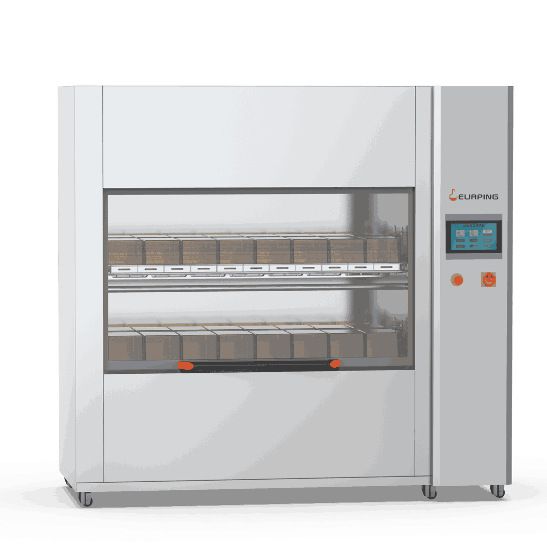 ケージ設置方式:洗浄チャンバー内のケージは傾斜配置および水平配置が可能であり、自動調整式洗浄ラックにより、マウス・ラット用ケージ、モルモット用ケージおよびウサギ用ケージなど、多様なケージの洗浄に対応する。